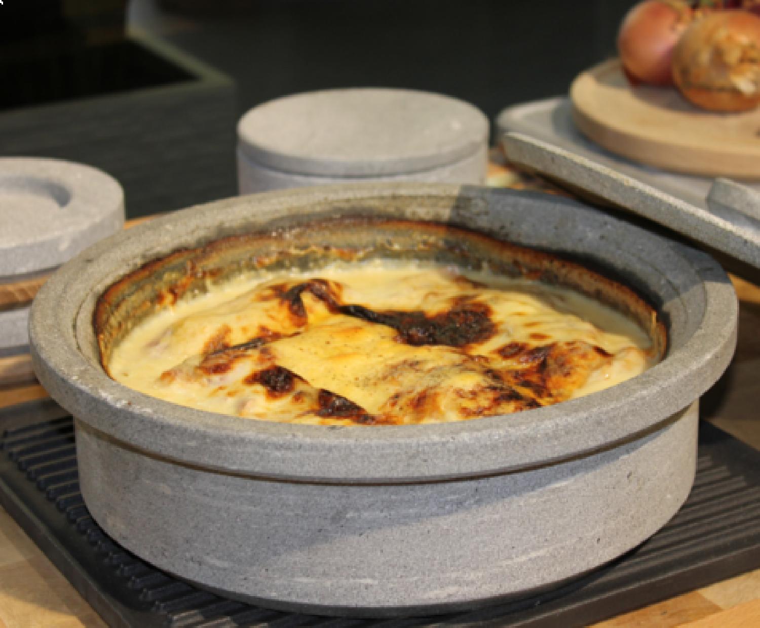 Mit dieser 2,5-Liter-Kasserolle mit Holzdeckel und Untertasse können Sie leckere Gerichte zubereiten und in Ihrem Tulikivi-Ofen garen. Legen Sie ihn einfach direkt auf den Kochrost oder auf den gusseisernen Grill für eine sanftere Hitze. Die Kasserolle dient sowohl als Back- als auch als Servierform, die Ihre Zubereitung warm hält.