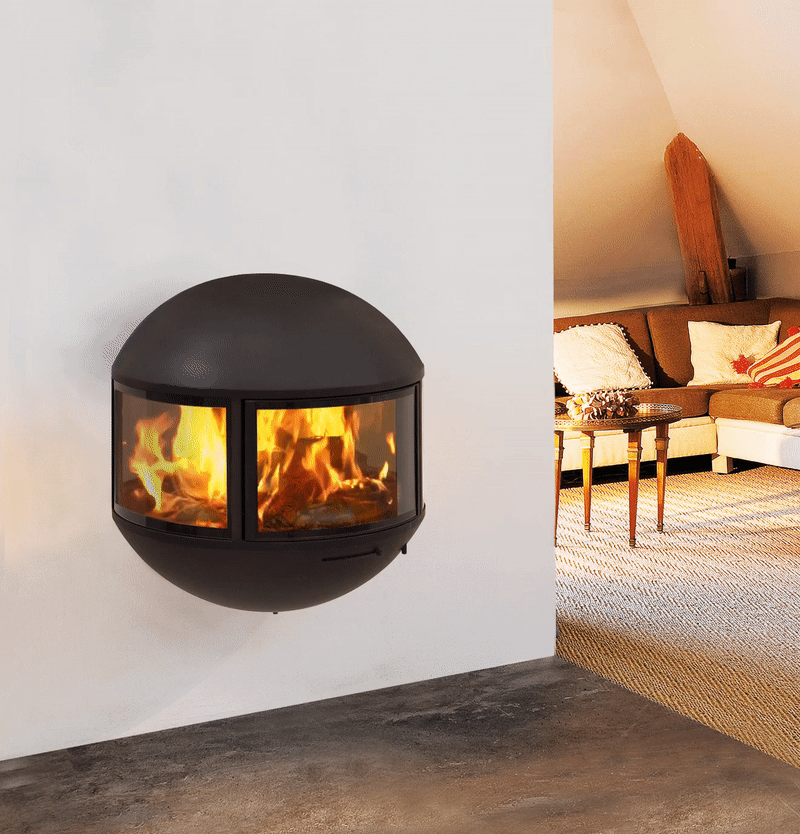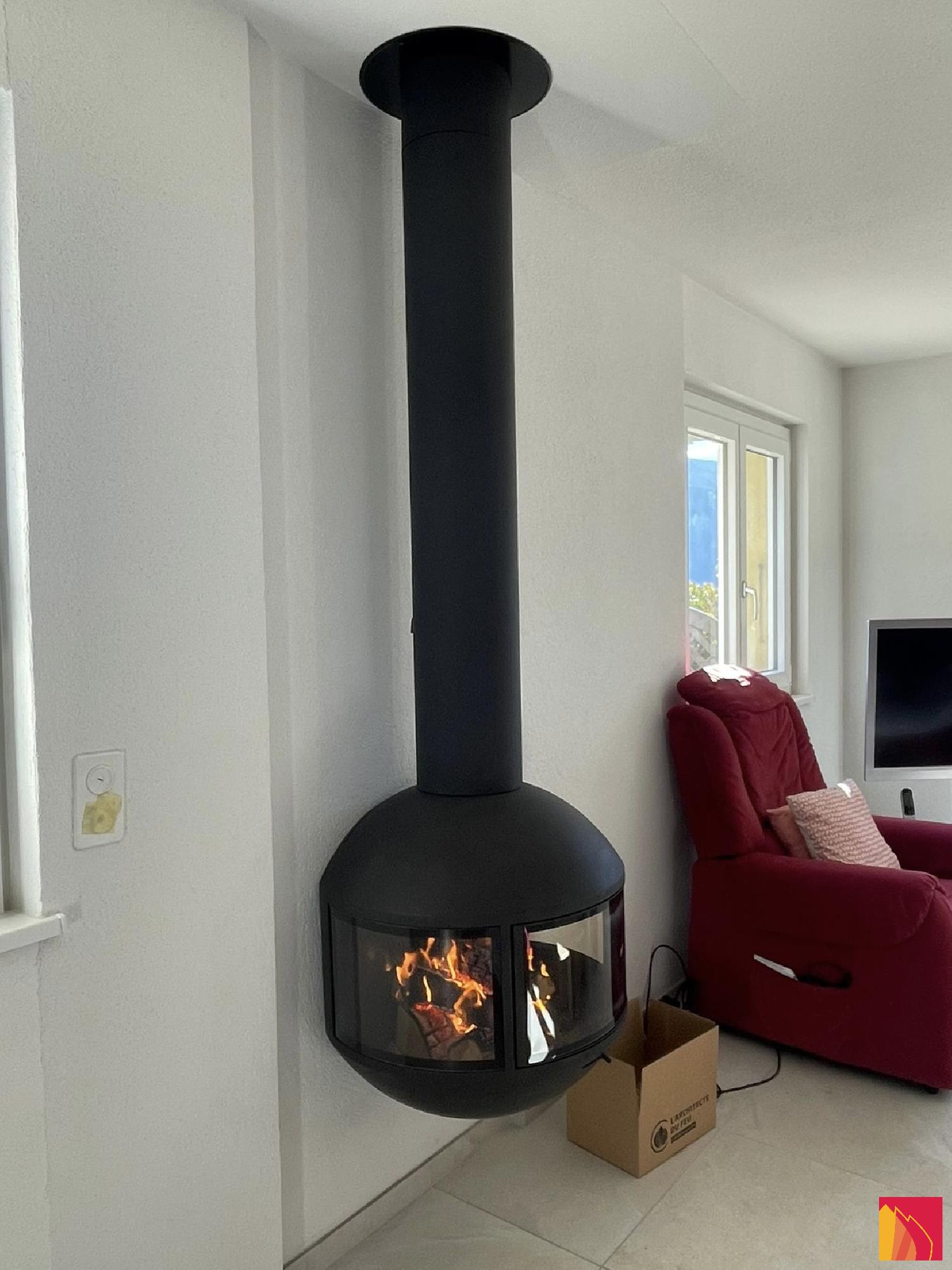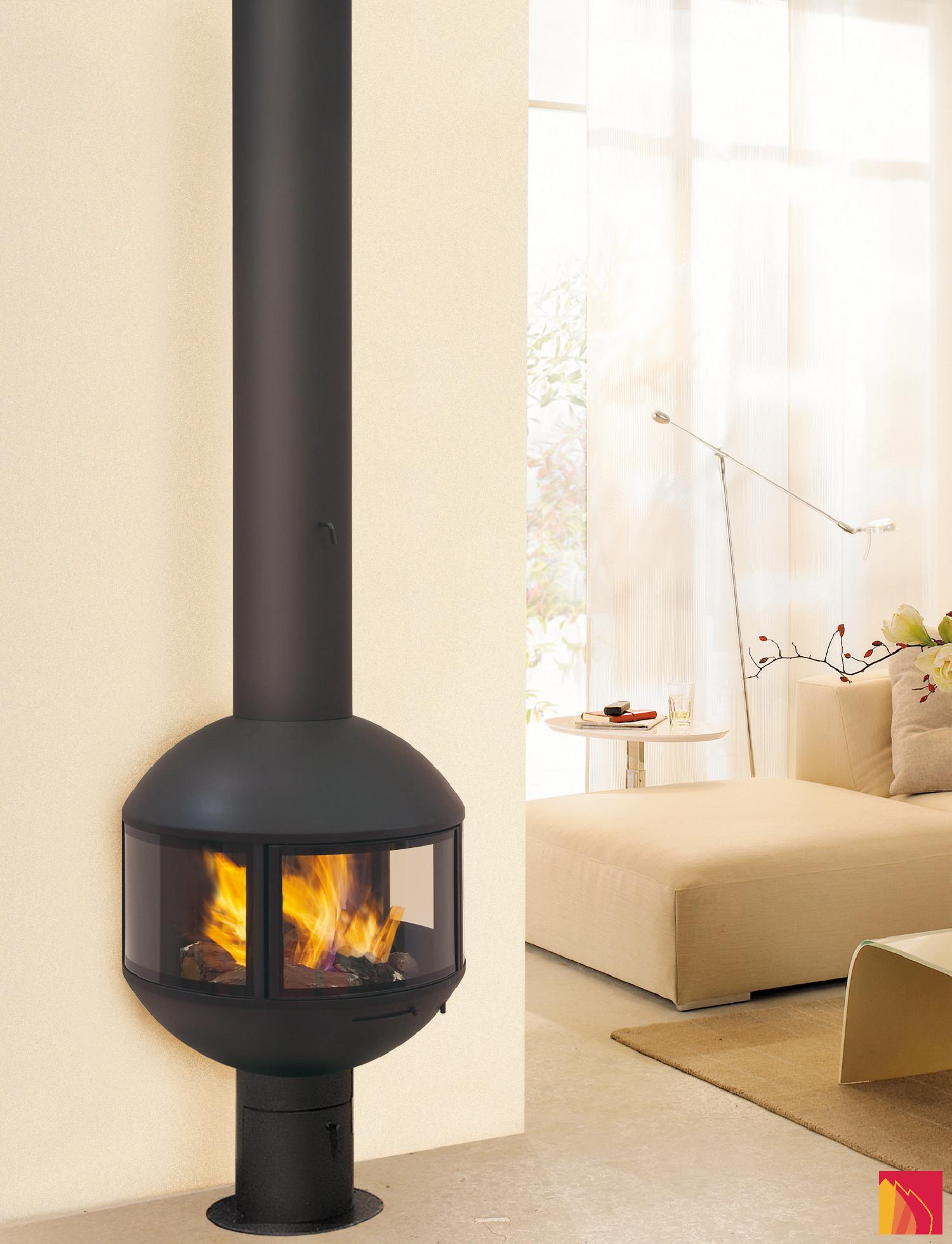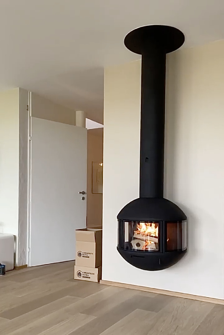 Em pé, com ou sem um tubo de chaminé visível, esta lareira de lenha permite muitos arranjos. Protegido em seu globo de vidro, o fogo é exibido discretamente para que todos vejam. Duas placas de vidro fixas e uma terceira, central, que funciona como uma porta, dão à Edofocus um máximo de segurança e facilidade de utilização.