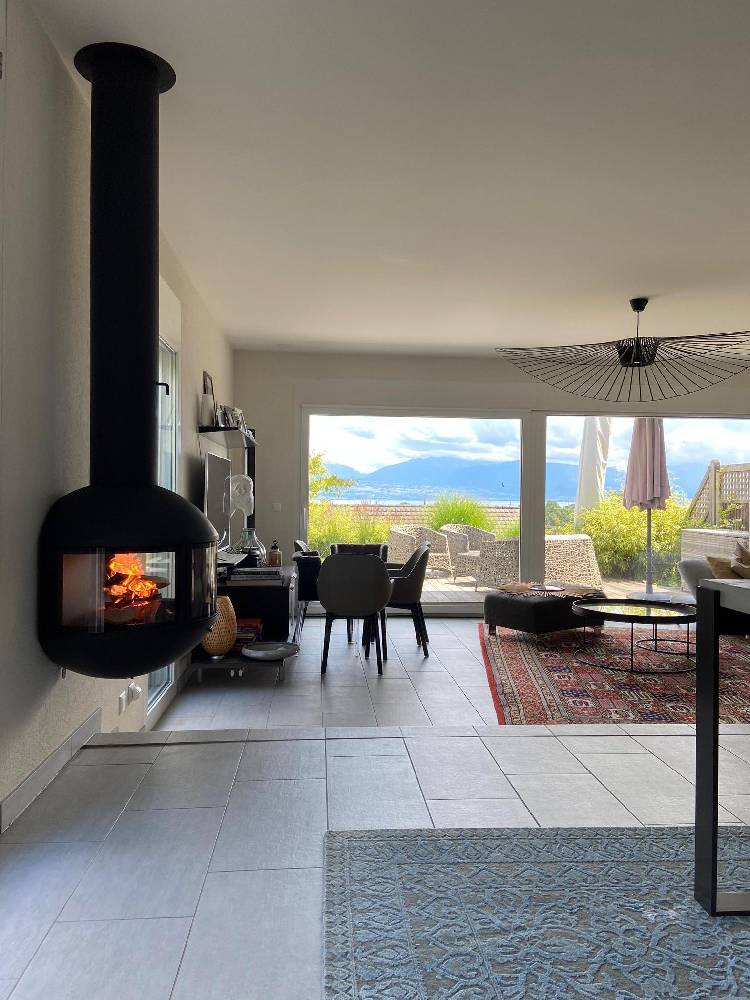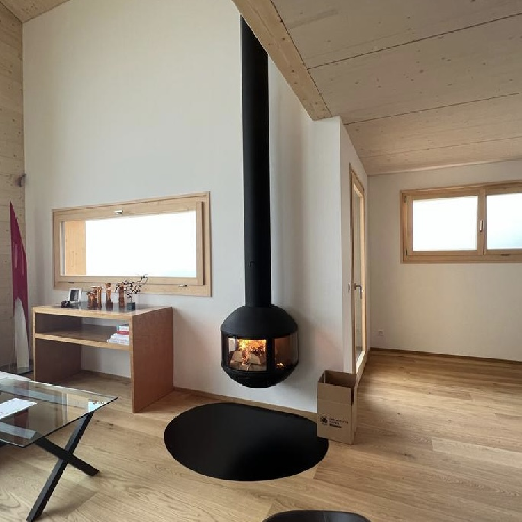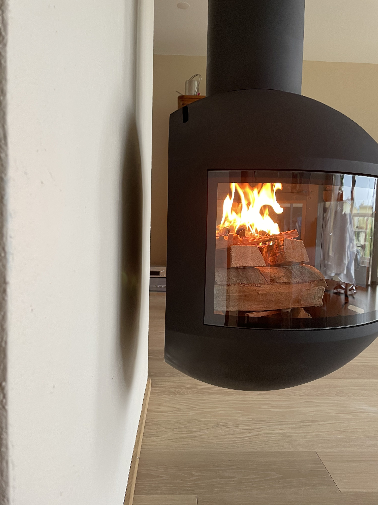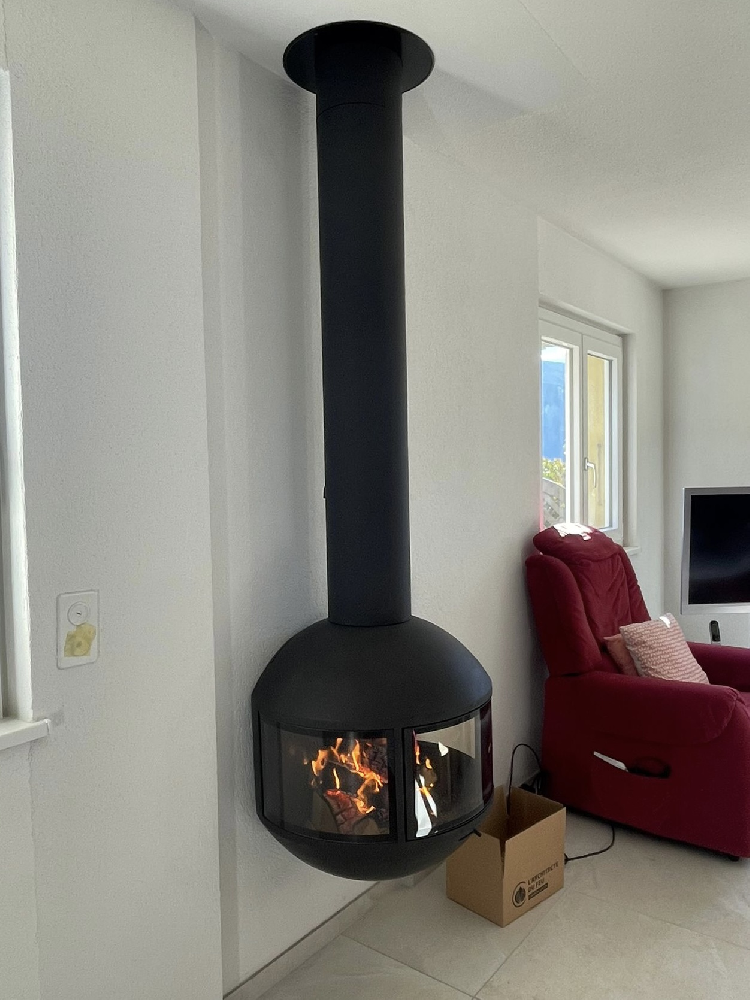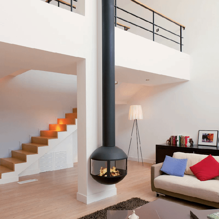 Em pé, com ou sem um tubo de chaminé visível, esta lareira de lenha permite muitos arranjos. Protegido em seu globo de vidro, o fogo é exibido discretamente para que todos vejam. Duas placas de vidro fixas e uma terceira, central, que funciona como uma porta, dão à Edofocus um máximo de segurança e facilidade de utilização.